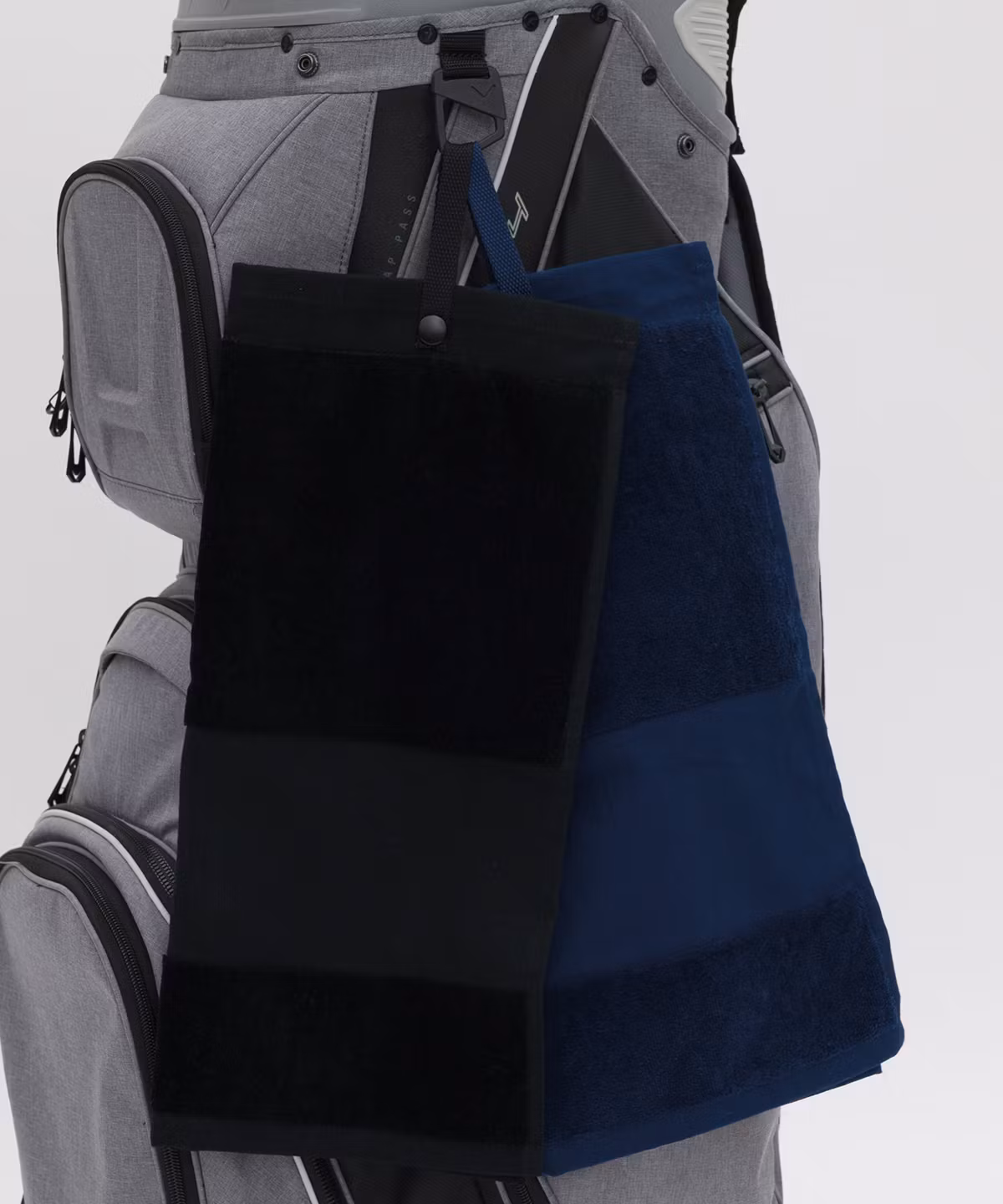 Deluxe golfhandduk i 100% bomull lyxig velour. Trippeldesign. Skrivbar kantsektion vid nederkanten. Vävd rem med YKK tryckknappslås. Mycket absorberande. Lyxig känsla.